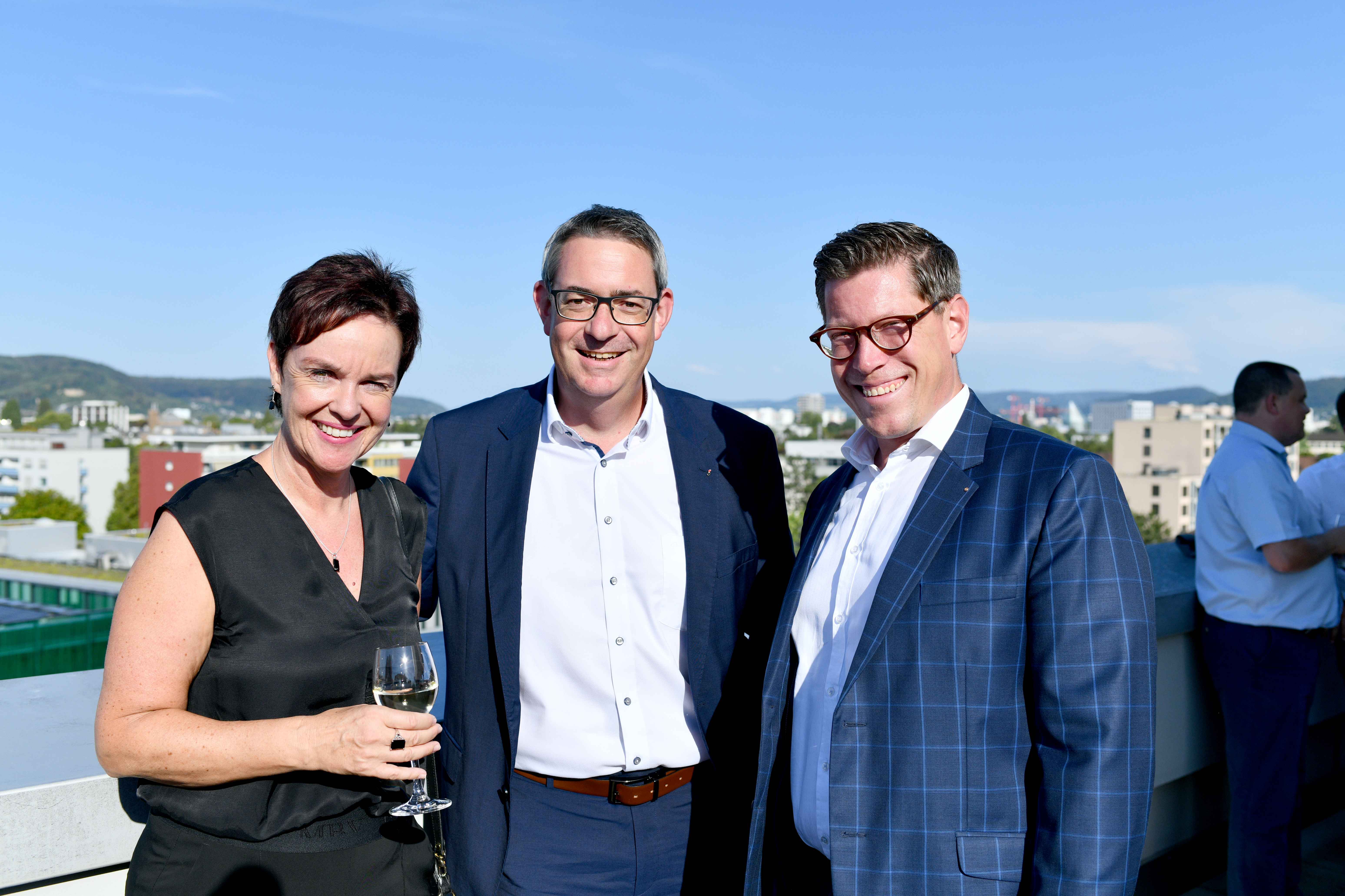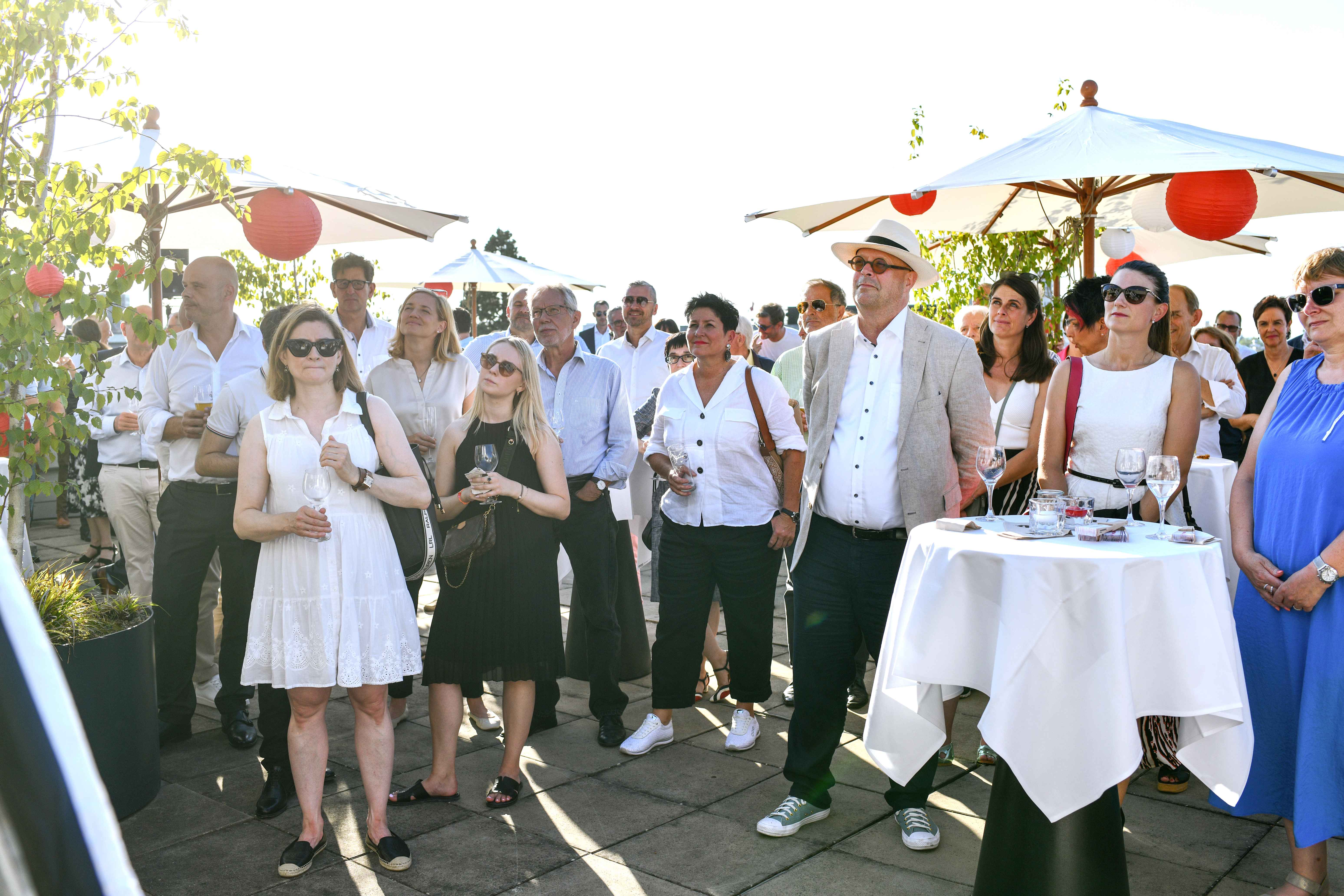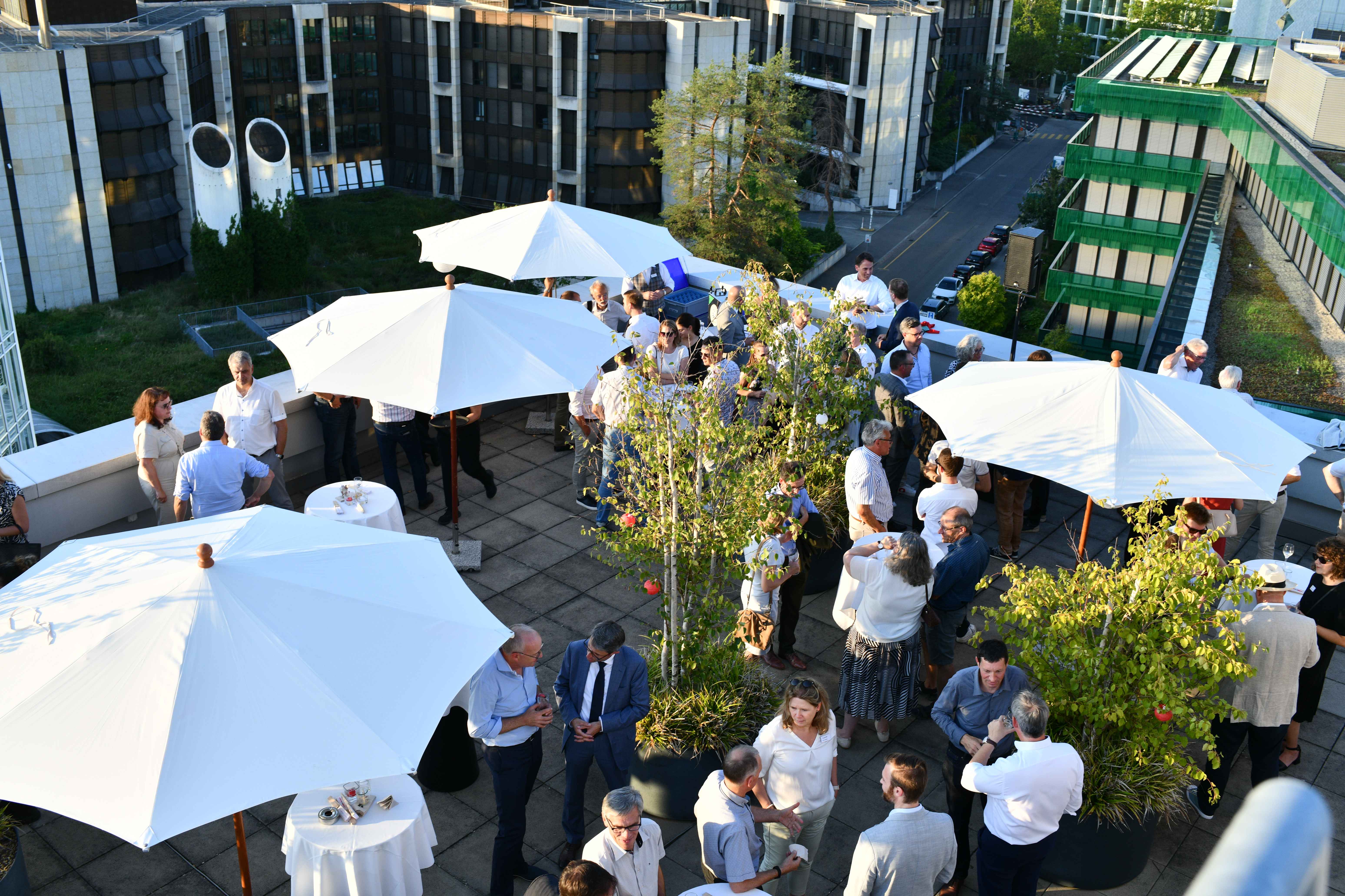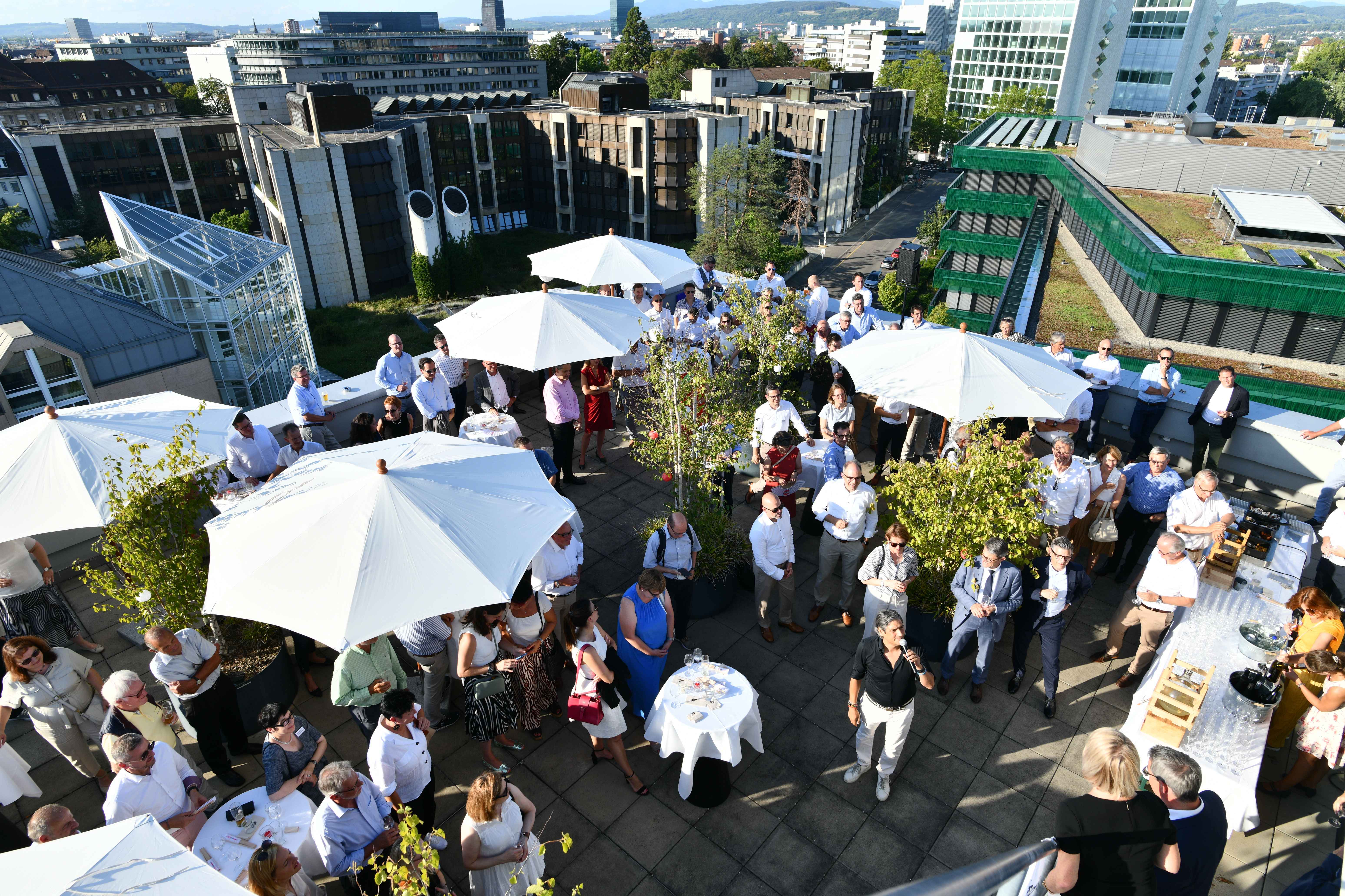 Über den Dächern von Basel trafen sich an unserem jährlichen Sommerapéro Vertreterinnen und Vertreter aus Wirtschaft und Politik zum Austausch.