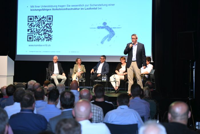 Moderiert durch Handelskammer-Direktor und Komitee N18-Vorsitzender Martin Dätwyler brachte der Abend wichtige Fragen auf den Tisch: Wie gedenkt der Bund die Engpässe entlang der Nationalstrasse 18 zwischen dem Angenstein und Delémont zu beheben? Welche Lösungen werden für die Totalsperre der Laufentaler Bahnlinie im Jahr 2025 gefunden? Was wird für bessere Verbindungen mit dem Velo getan?