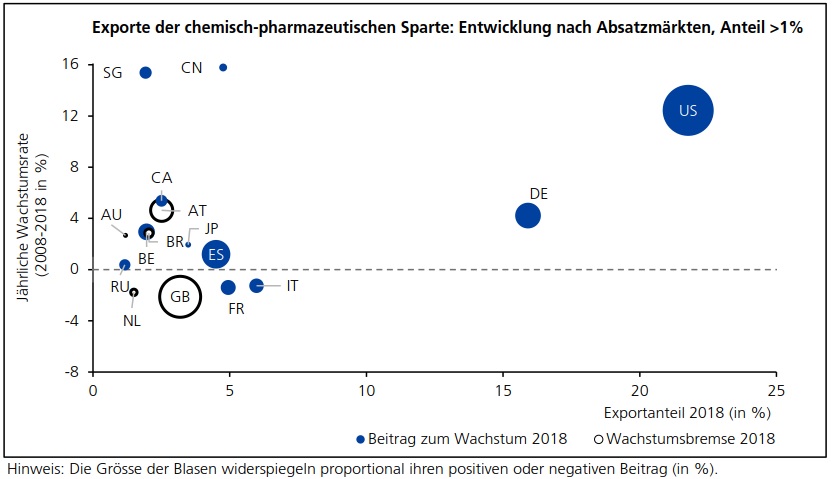 Die chemisch-pharmazeutischen Produkte verteidigten 2018 ihren markanten Exportanteil von 45 Prozent, gefolgt von Maschinen und Elektronik, Uhren und Präzisionsinstrumenten. Die chemisch-pharmazeutische Branche war in den vergangenen zehn Jahren die treibende Kraft des Schweizer Exportwachstums. Ein Blick auf die Absatzmärkte dieser Industrie zeigt, dass die USA mit Abstand der wichtigste Markt ist und eine sehr hohe Dynamik aufweist. In den letzten zehn Jahren boomten aber auch die Ausfuhren nach China mit einem durchschnittlichen Wachstum von 16 Prozent pro Jahr.
