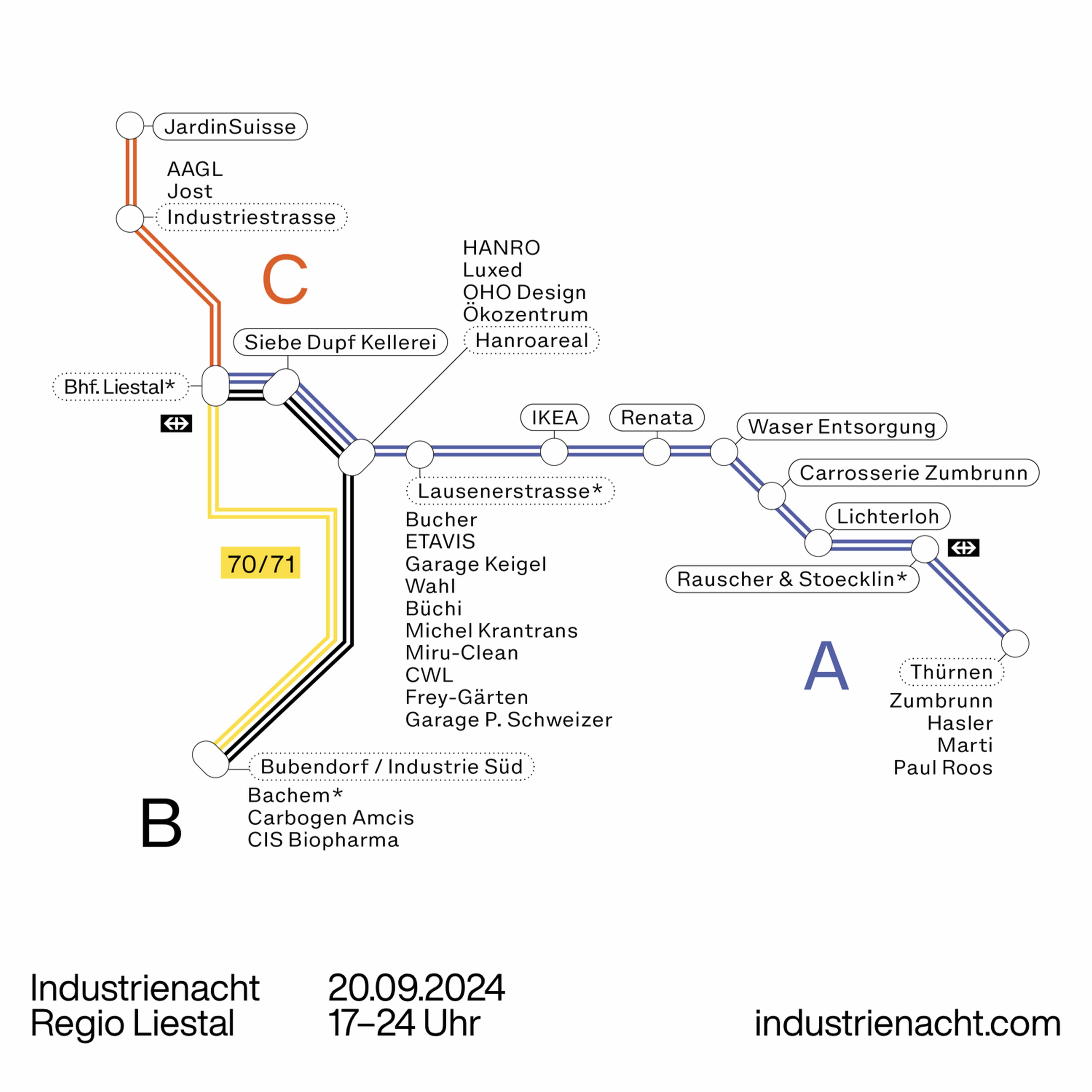 An der Industrienacht Regio Liestal bietet sich die Möglichkeit, einen Blick hinter die Kulissen der kleinen und grossen Arbeitswelten von Liestal, Bubendorf, Itingen, Sissach und Thürnen zu werfen. 31 Unternehmen öffnen für das breite Publikum ihre Türen. Sie nehmen uns mit auf Rundgänge, laden zu spielerischen Workshops ein und beantworten Fragen, die uns vielleicht schon lange auf der Zunge brennen. Rund die Hälfte der 70 Programmpunkte ist interaktiv, viele setzen keine Sprachkenntnisse voraus, einige werden zudem auch auf Englisch und Französisch angeboten. Shuttle-Busse auf drei Linien bringen die Besuchenden von Arbeitswelt zu Arbeitswelt: Linie A verbindet Liestal mit Itingen, Sissach und Thürnen, Linie B verkehrt zwischen Liestal und Bubendorf und Linie C erschliesst den Norden des Kantonshauptorts.