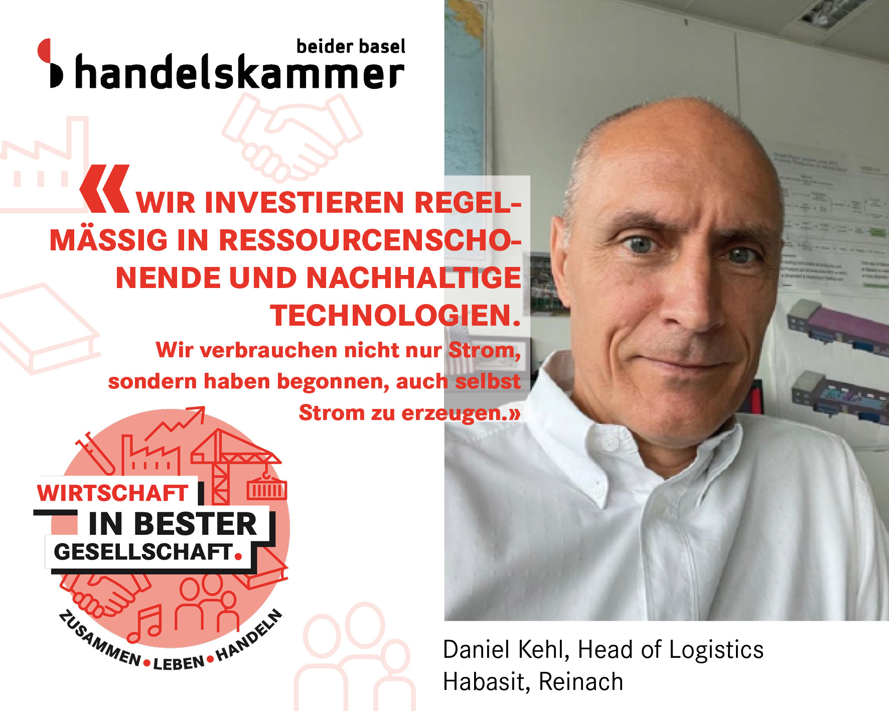 Die Region Basel ist die Heimat zahlreicher Exportfirmen. Der Grossteil davon sind kleinere und mittlere Unternehmen. Sie sind hoch innovativ und verkaufen ihre Produkte in der ganzen Welt. Eines dieser Unternehmen ist die Habasit AG aus Reinach. Das KMU ist Marktführer für Transportbänder und Antriebsriemen. Vom Erfolg von Habasit profitiert nicht nur unsere Region, sondern auch die Umwelt und die Menschen in anderen Ländern. Wir haben mit Daniel Kehl, Leiter Logistik Schweiz, über das Erfolgsrezept von Habasit und die Bedeutung von Nachhaltigkeit gesprochen.