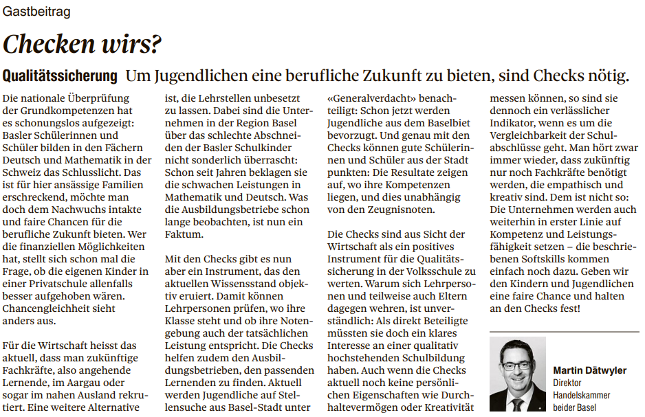 Gastbeitrag zu den Leistungschecks in der Basler Zeitung vom 12. November von Handelskammer-Direktor Martin Dätwyler.