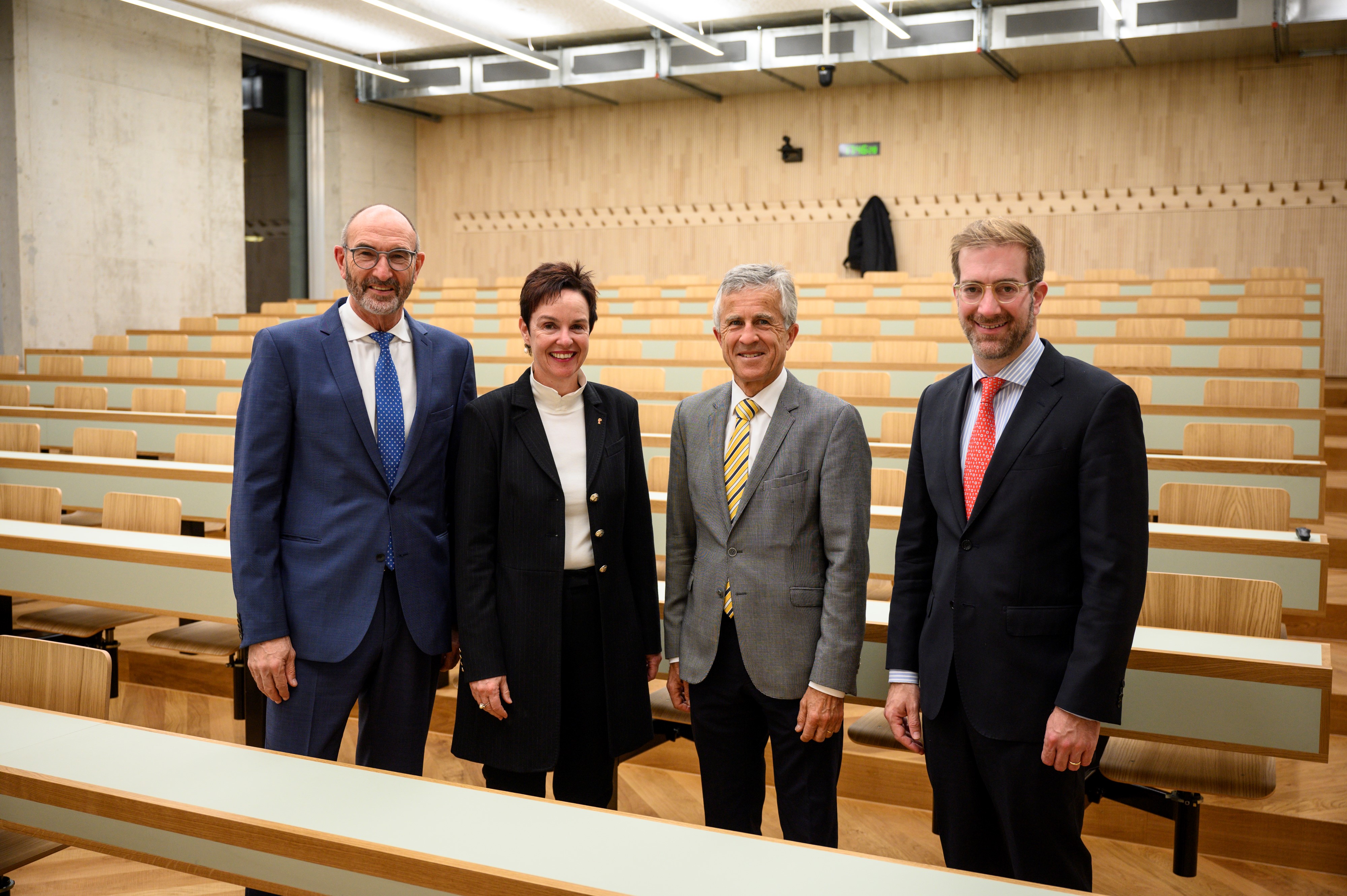 Von links nach rechts: Departementsvorsteher Prof. Dr. Uwe Pühse, Regierungsrätin Monica Gschwind, Universitätsratspräsident Dr. Beat Oberlin und Regierungsrat Dr. Conradin Cramer an der feierlichen Eröffnung des Neubaus für Sport, Bewegung und Gesundheit (Foto: Universität Basel, Dominik Plüss).