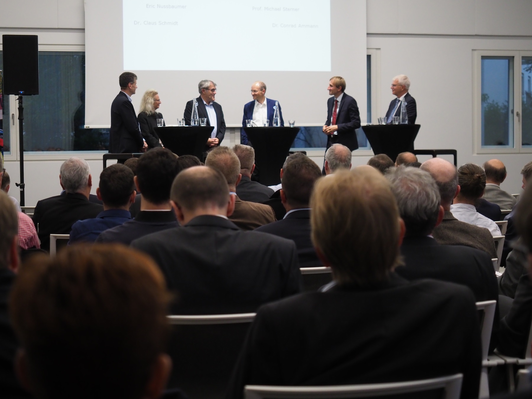 Über die Chancen und Risiken der aussichtsreichen Möglichkeit einer Zwischenspeicherung diskutierten am anschliessenden Podiumsgespräch Dr. Conrad Ammann, CEO Primeo Energie, Dr. Claus Schmidt, CEO IWB, Daniela Decurtins, Direktorin Verband Schweizerische Gasindustrie und Nationalrat Eric Nussbaumer, Mitglied nationalrätliche Kommission für Umwelt, Raumplanung und Energie. Im Fokus standen hierbei neben der Kosteneffizienz sowie der Praxistauglichkeit auch politische Fehlanreize, notwendige Rahmenbedingungen und die Grenzen der Technologie.