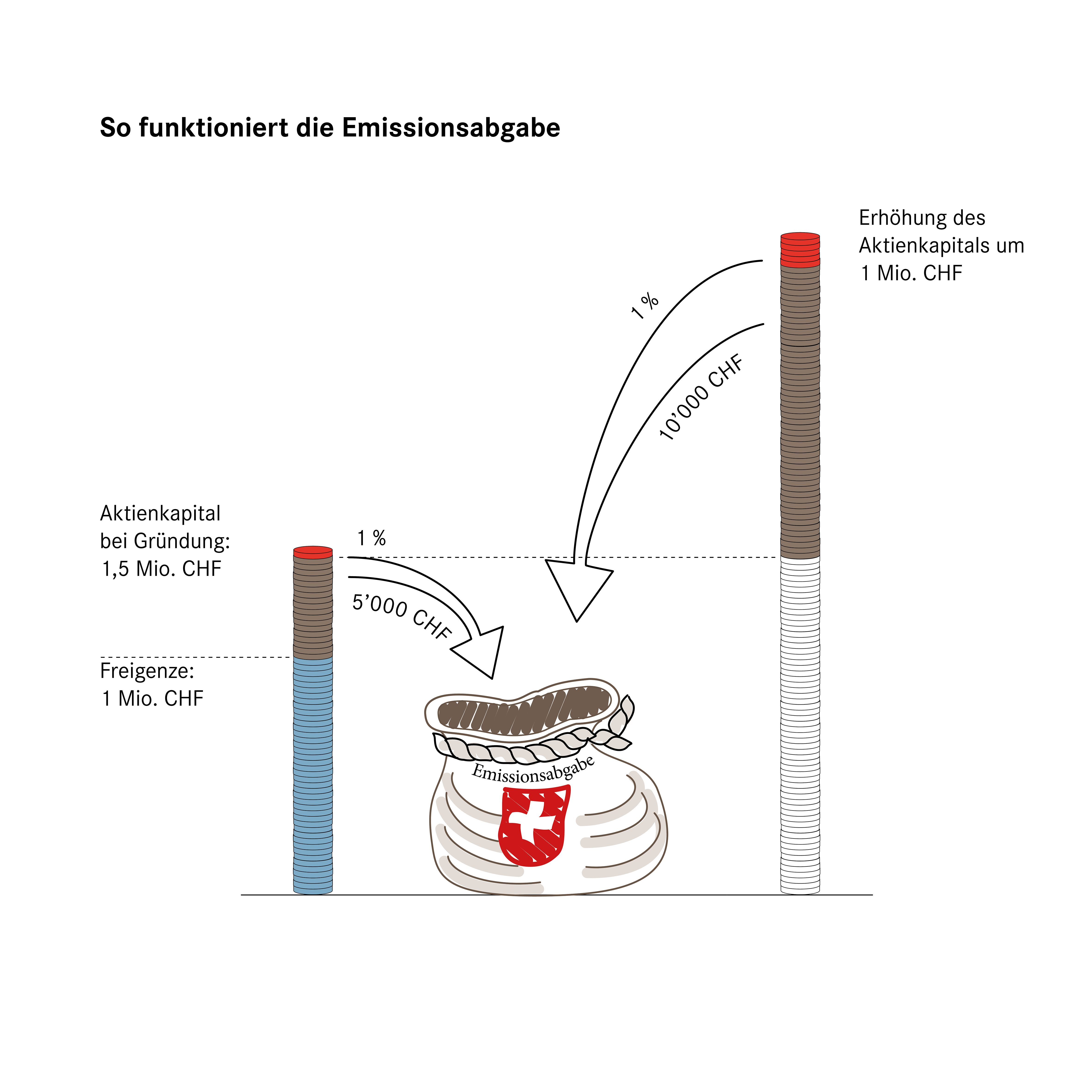 Die Emissionsabgabe ist eine Steuer, die erhoben wird, wenn ein inländisches Beteiligungsrecht ausgegeben wird. Dies kann beispielsweise die Gründung einer Aktiengesellschaft oder eine Aktienkapitalerhöhung sein. Betroffen sind Aktien bei Aktiengesellschaften, Stammeinlagen bei einer GmbH, Genossenschaftsanteile bei Genossenschaften sowie Genuss- und Partizipationsscheine. Gegenwärtig beträgt die Höhe der Steuer 1 Prozent, wobei eine Freigrenze von einer Million Franken besteht.