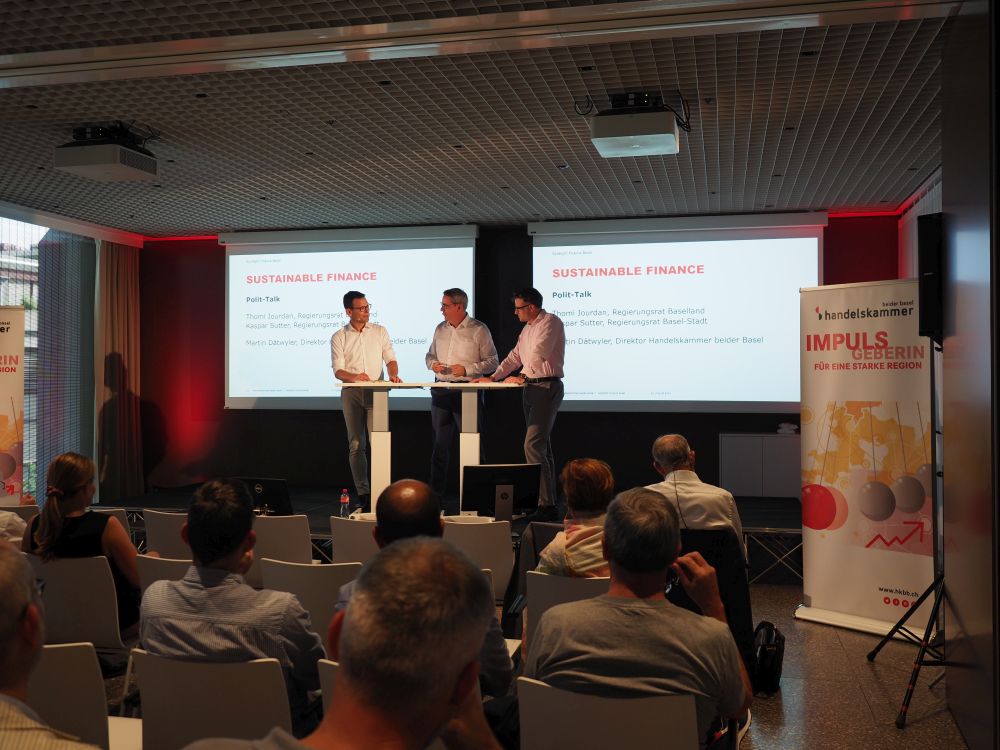 Die Volkswirtschaftsdirektoren der beiden Basel, Thomi Jourdan und Kaspar Sutter, sprachen nach den Breakout-Sessions mit Martin Dätwyler, Direktor Handelskammer beider Basel, über die Bedeutung der Finanzbranche für die Region, die Möglichkeiten für die Kantone im Bereich Sustainable Finance aktiv zu werden und über die Forderungen von Aktivisten gegenüber der Bank für Internationalen Zahlungsausgleich (BIZ). Es wurde klar, dass Sustainable Finance kein kantonales Thema ist, sondern der Bund hier die Hoheit hat. Dennoch sahen beide Regierungsräte die Verantwortung der Kantone bei den Kantonalbanken und den kantonalen Pensionskassen. Dort sei ESG klar implementiert. Regulierungsbedarf auf kantonaler Ebene wurde von beiden Gesprächsteilnehmern nicht gesehen. Grossunternehmen würden ohne Gesetze hohe Anforderungen an sich selbst stellen und damit die Lieferanten zwingen gewisse Standards zu erfüllen. Somit reguliere sich der Markt diesbezüglich selbst.